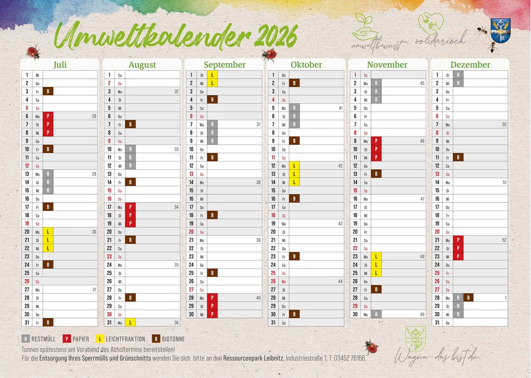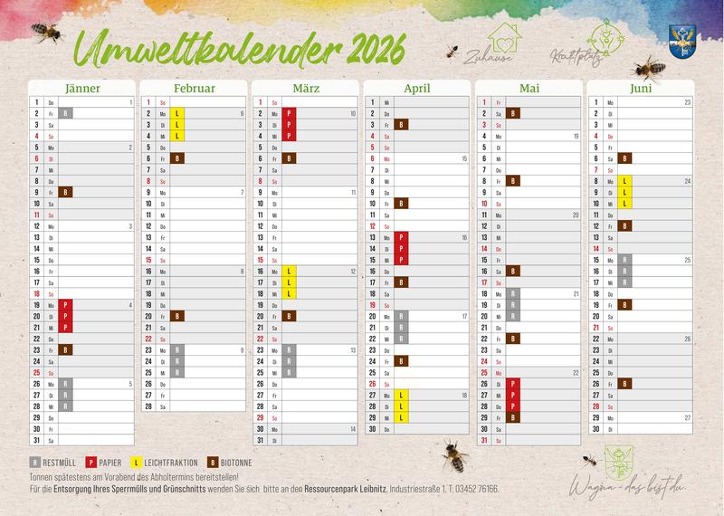 Den aktuellen Umweltkalender mit allen Abfuhrterminen für das Jahr 2026 finden Sie hier zum Download.